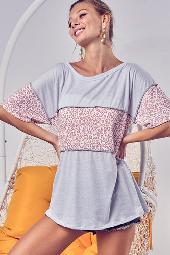 BiBi Leopard Asymmetrical Cold Shoulder Mock Neck T-Shirt