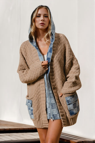 Double Take Full Size Hooded Denim Spliced Sweater Cardigan