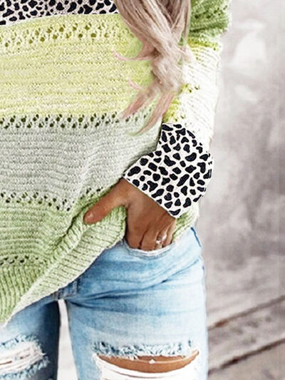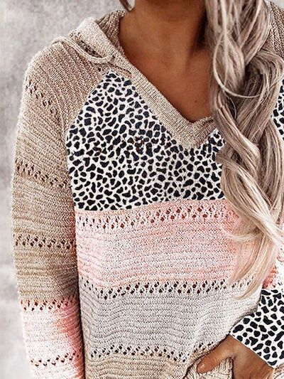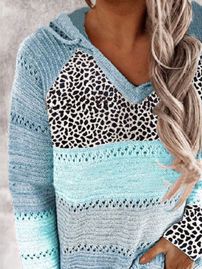 Full Size Openwork Leopard Drawstring Hooded Sweater