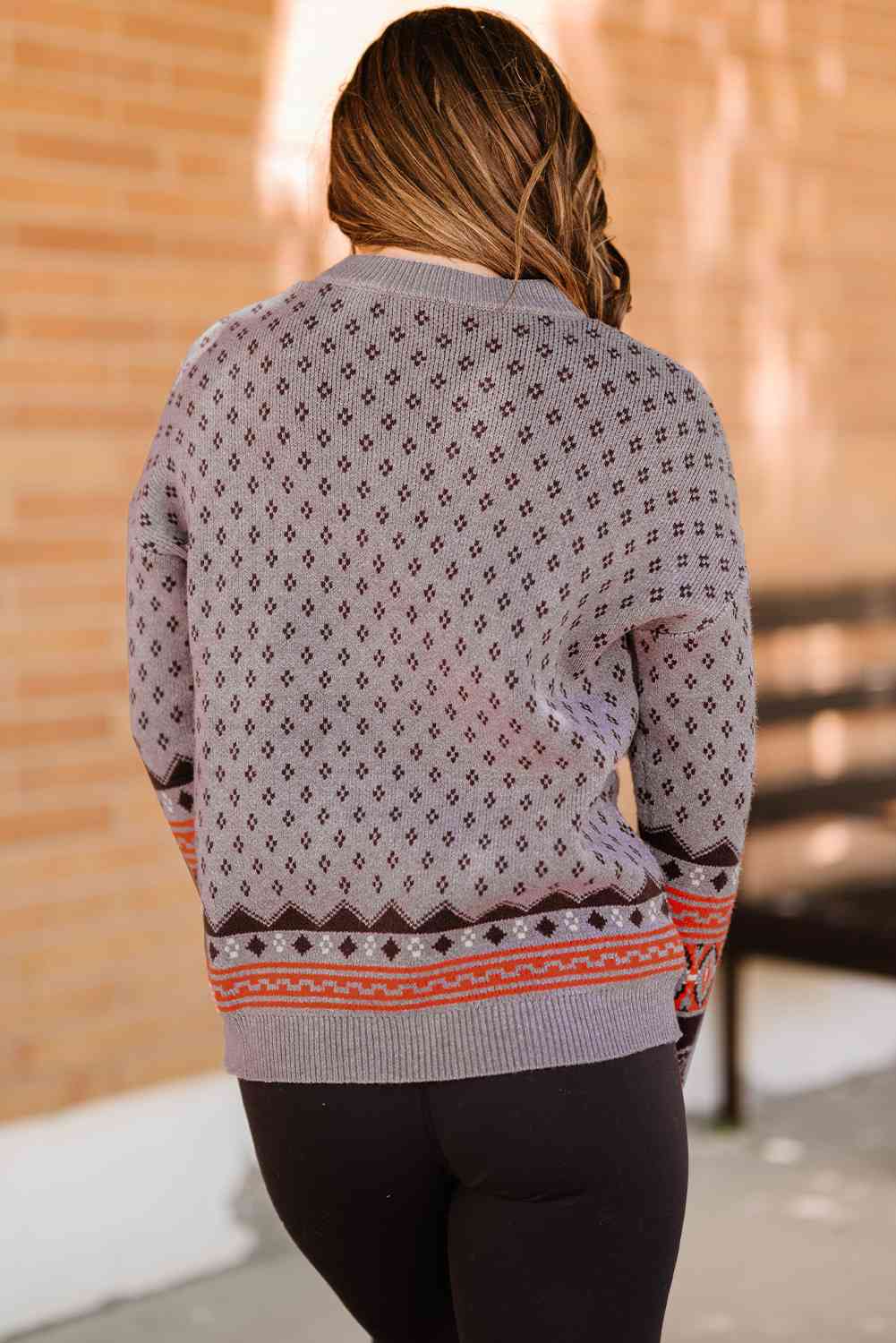 Geometrical Pattern Round Neck Dropped Shoulder Pullover Sweater