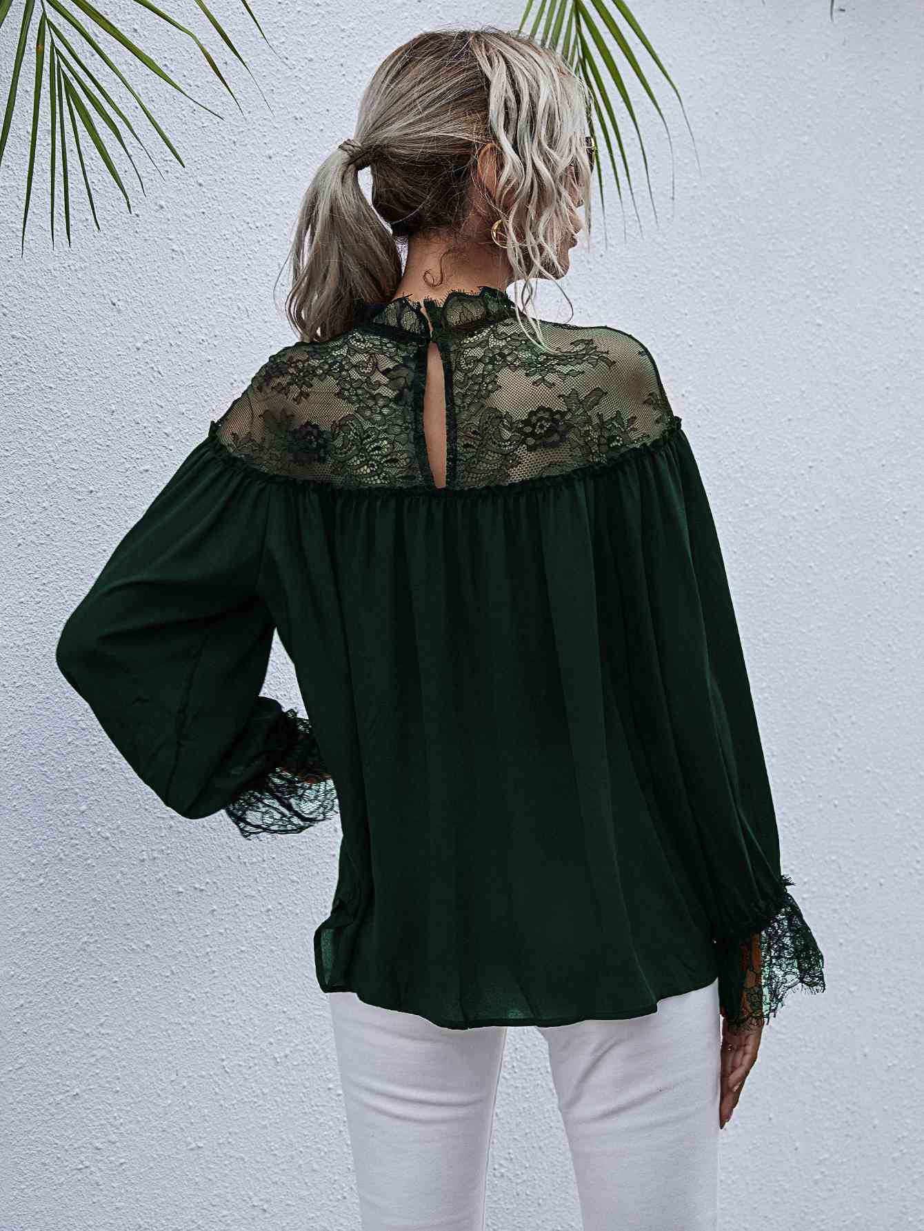 Semi-Sheer Lace Trim Mock Neck Blouse
