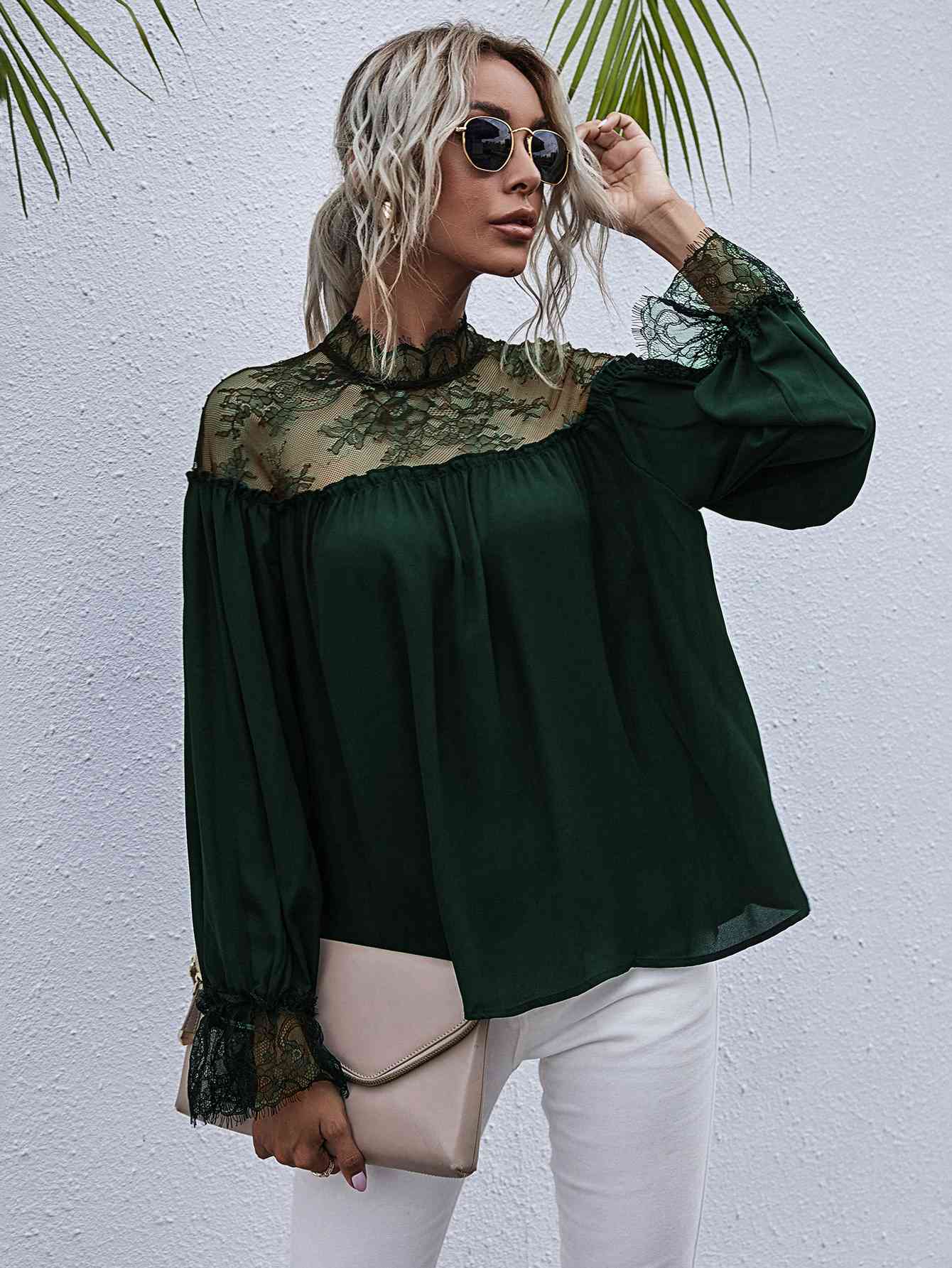 • Load image into Gallery viewer, Semi-Sheer Lace Trim Mock Neck Blouse