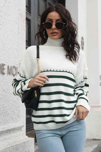 Striped Zip-Up Long Sleeve Ribbed Sweater
