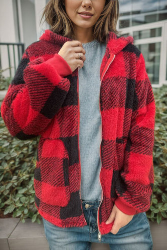 Double Take Full Size Plaid Long Sleeve Hooded Coat