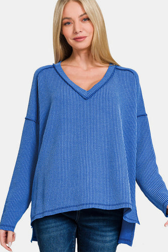 Zenana Texture Exposed Seam V-Neck Long Sleeve T-Shirt