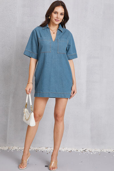 Pocketed Collared Neck Mini Denim Dress