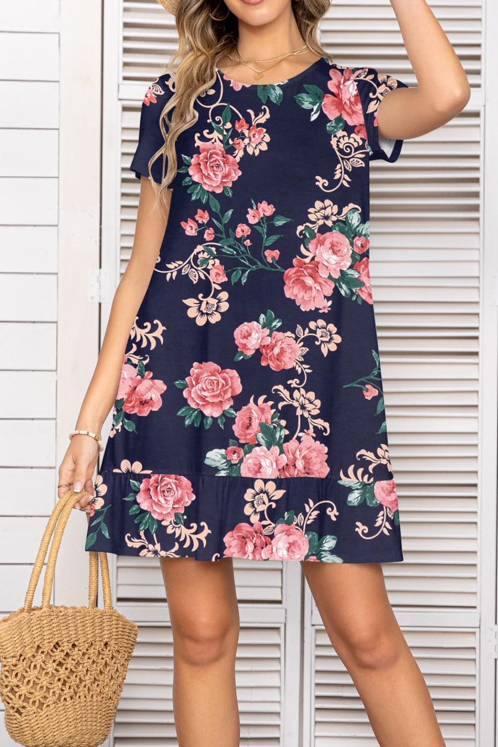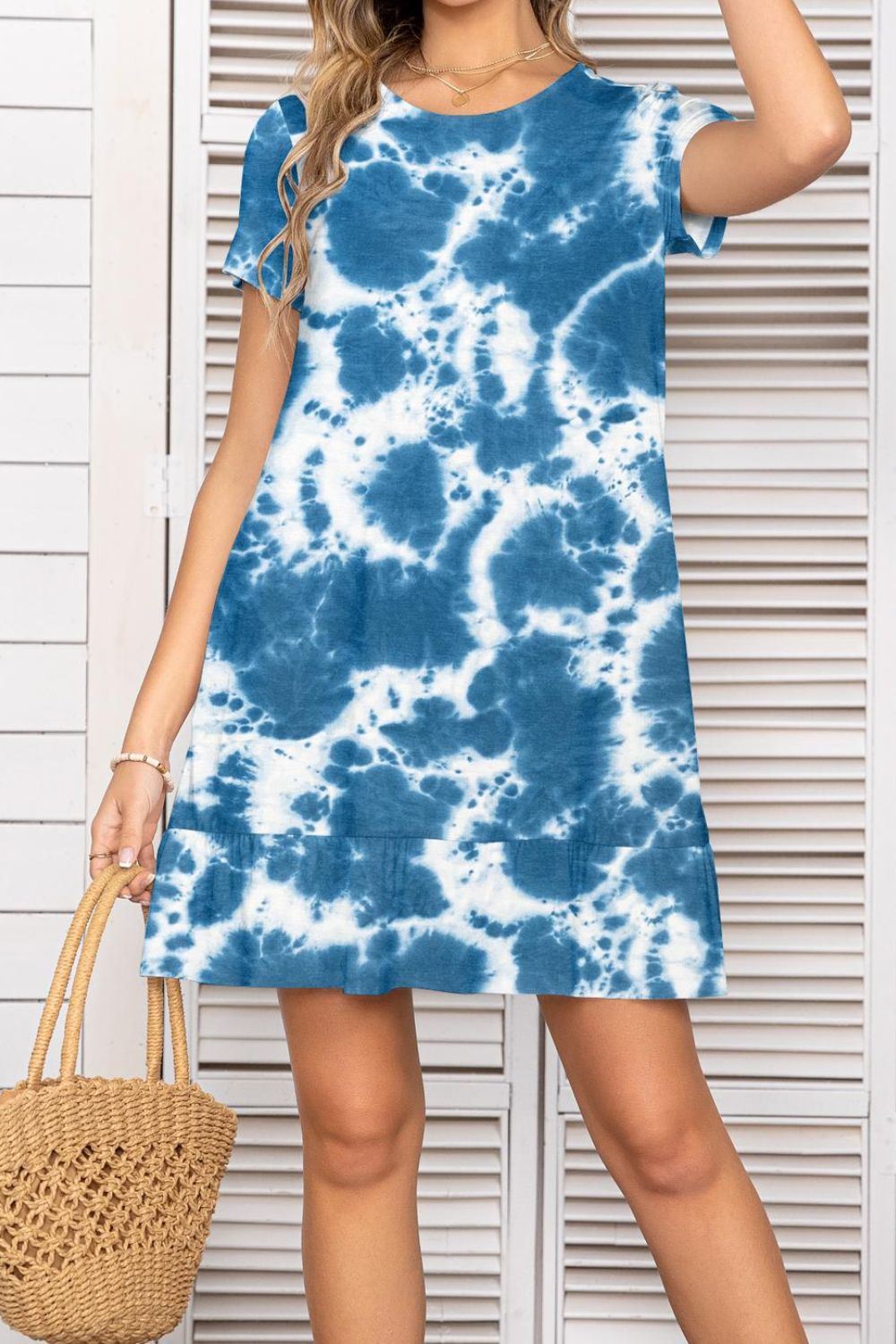 Printed Round Neck Short Sleeve Mini Dress with Pockets