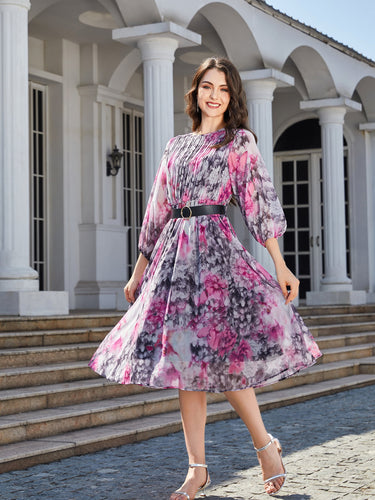 Floral Print Round Neck Balloon Sleeve Midi Dress