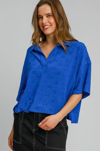 Umgee Floral Johnny Collar Half Sleeve Jacquard Top