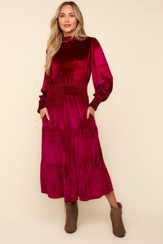 Haptics Mock Neck Smocked Waist Velvet Tiered Dress