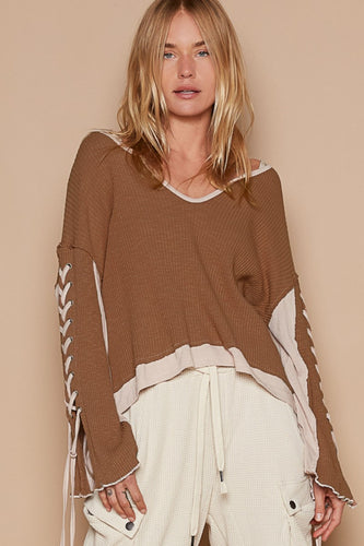 POL Lace-Up Sleeve Color Block Ribbed Knit Top