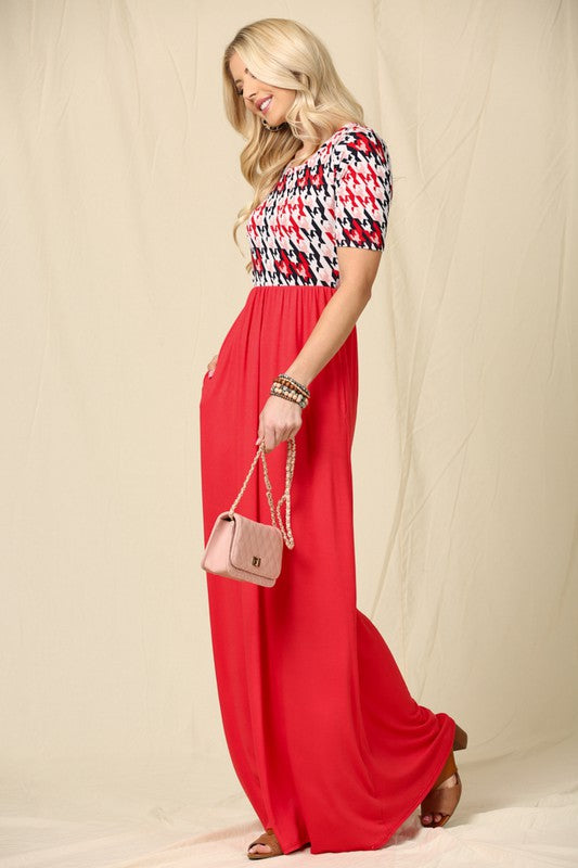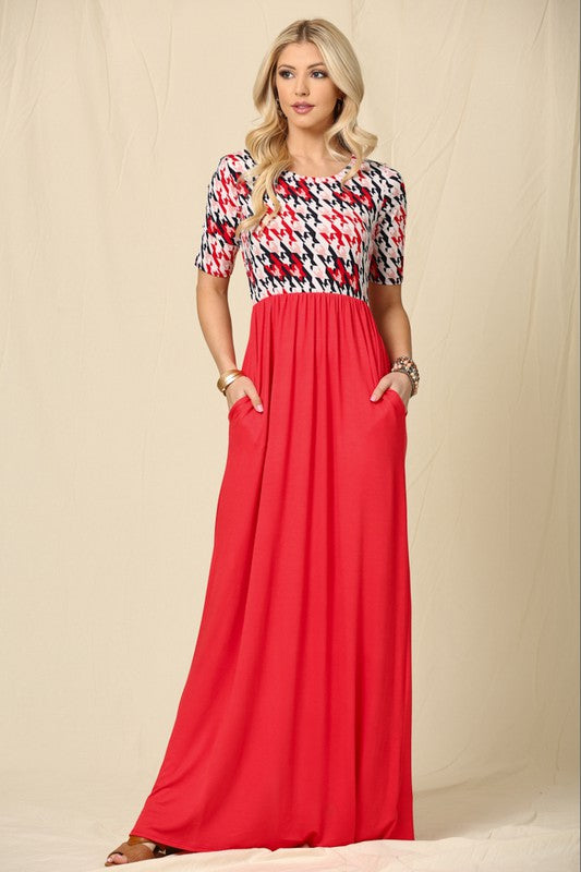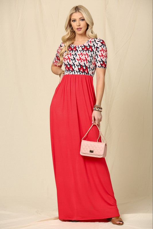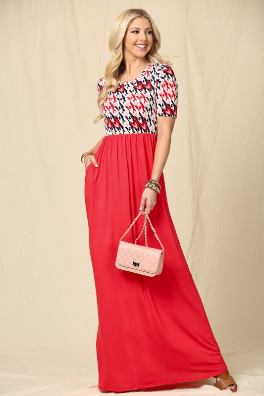 A houndstooth round neck short sleeve maxi dress is a classic and sophisticated option for your wardrobe. Houndstooth is a timeless pattern that adds a touch of elegance to any outfit. This style of dress can be dressed up with heels and statement jewelry for a formal event or dressed down with flats for a more casual look. It's a versatile piece that you can wear for different occasions. Enjoy styling and wearing your houndstooth maxi dress!