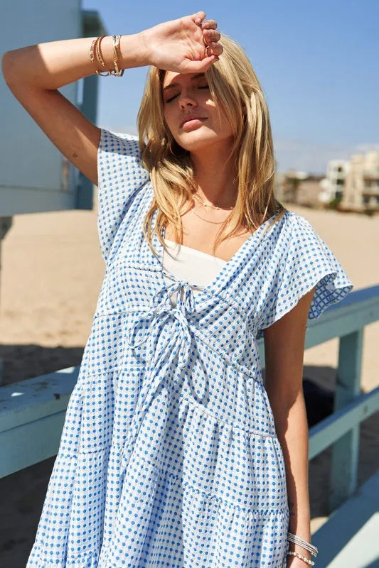 The Jacquard V-neck flutter cap sleeve tiered dress is an elegant and feminine garment featuring a V-neckline, flutter cap sleeves, and tiered design. The jacquard fabric adds texture and refined detail to the dress, while the tiered silhouette creates a flowy and flattering look. This dress is perfect for special occasions or events where you want to make a stylish and sophisticated statement.