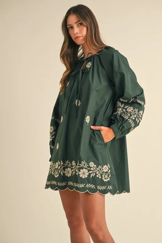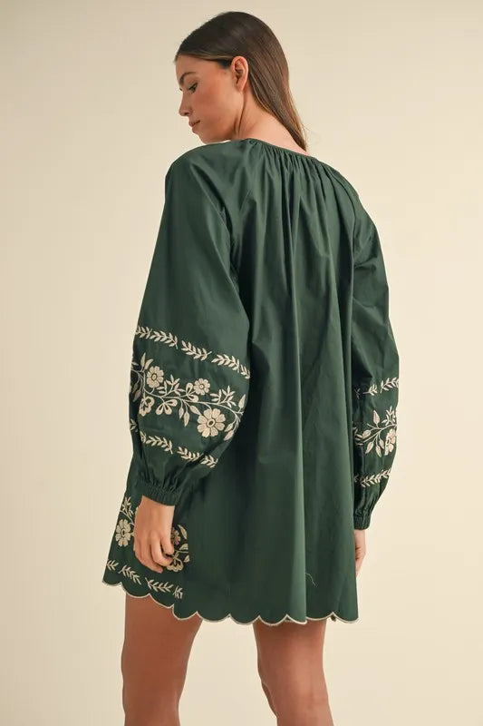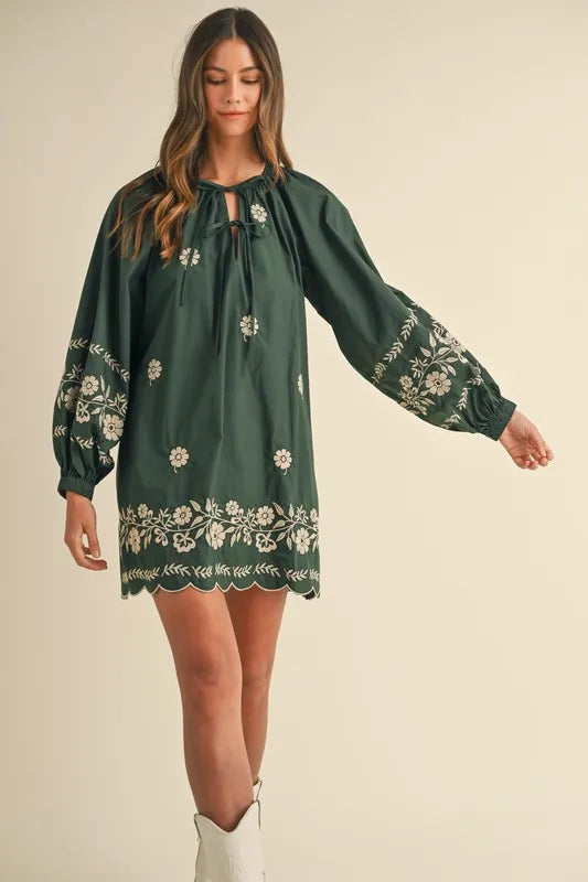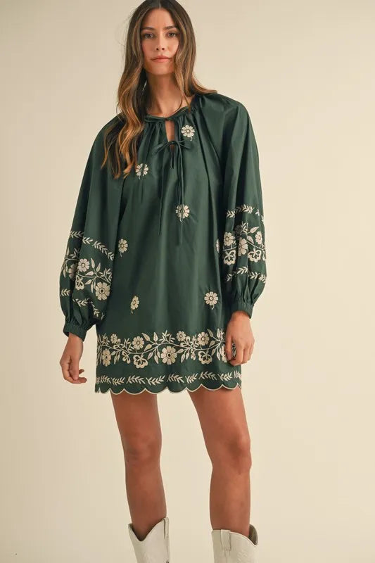 The Embroidered Long Sleeve Peasant Mini Dress is a perfect blend of bohemian charm and timeless elegance. Featuring delicate embroidery along the neckline and cuffs, this dress adds a touch of artistry to its flowing silhouette. The long sleeves and relaxed fit give it a comfortable, airy feel, while the mini length adds a playful twist. Crafted from soft, breathable fabric, it’s perfect for both casual outings and special occasions. Pair it with sandals or ankle boots for a laid-back yet stylish look that effortlessly captures the essence of carefree, modern fashion.