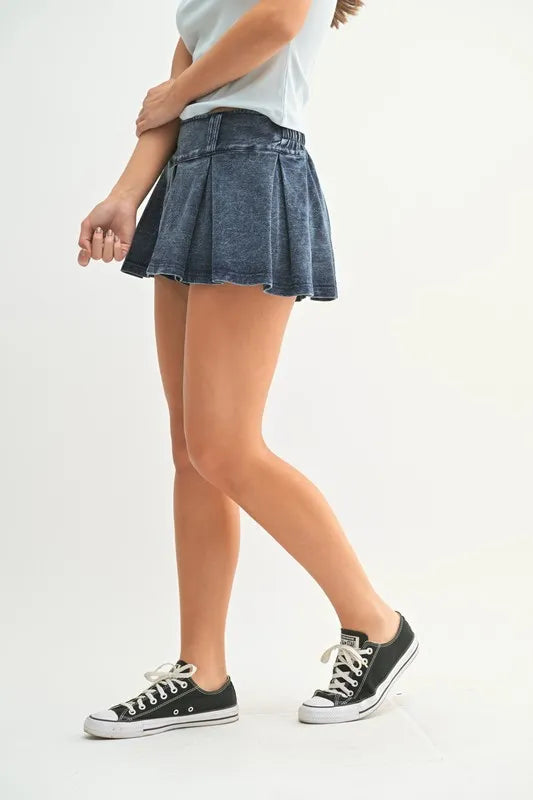 The Mineral Wash Pleated Mini Skort is a stylish and versatile piece that combines the femininity of a skirt with the practicality of shorts. The mineral wash gives it a unique and edgy look with subtle color variations. The pleated design adds a fun and playful element to the skort, creating movement and flow. Perfect for a casual day out or a summer event, this skort offers a comfortable and stylish option for various occasions. Pair it with a tucked-in blouse or a cropped top for a chic and trendy ensemble. Stay on-trend and fashion-forward with the Mineral Wash Pleated Mini Skort for a versatile and eye-catching outfit choice.