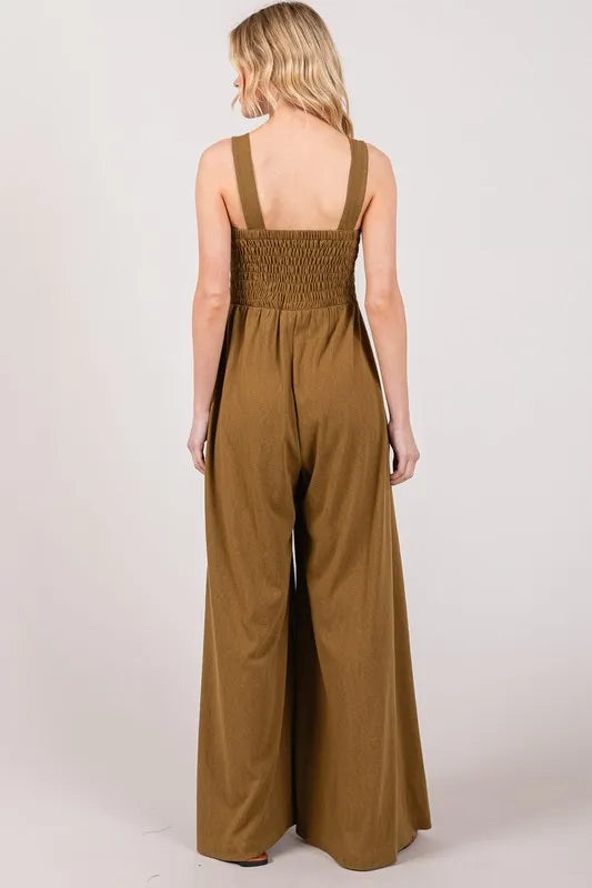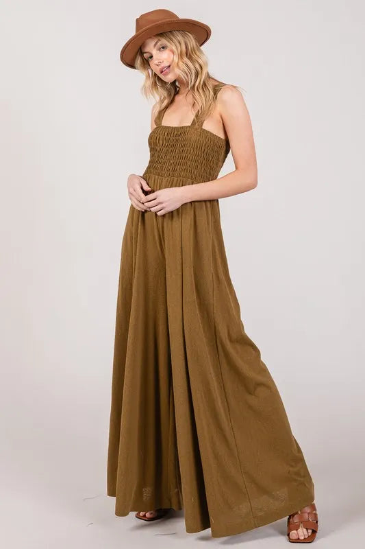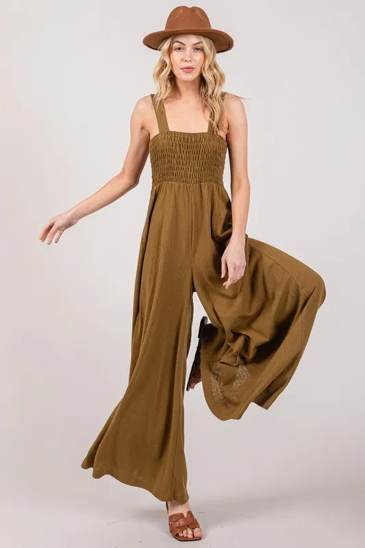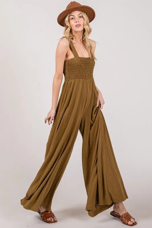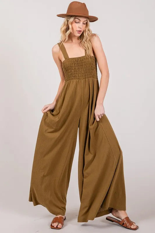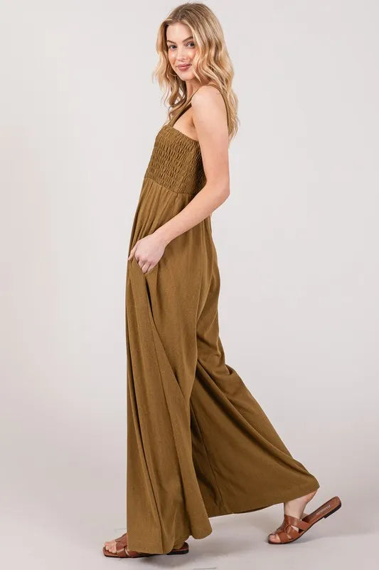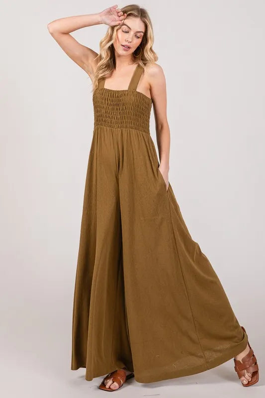 A smocked flowy wide leg jumpsuit is a fashionable and comfortable one-piece outfit. The smocked bodice offers a stretchy and fitted silhouette, while the flowy wide legs provide a relaxed and breezy feel. This jumpsuit is perfect for a stylish and effortless look, ideal for various occasions from casual outings to semi-formal events.