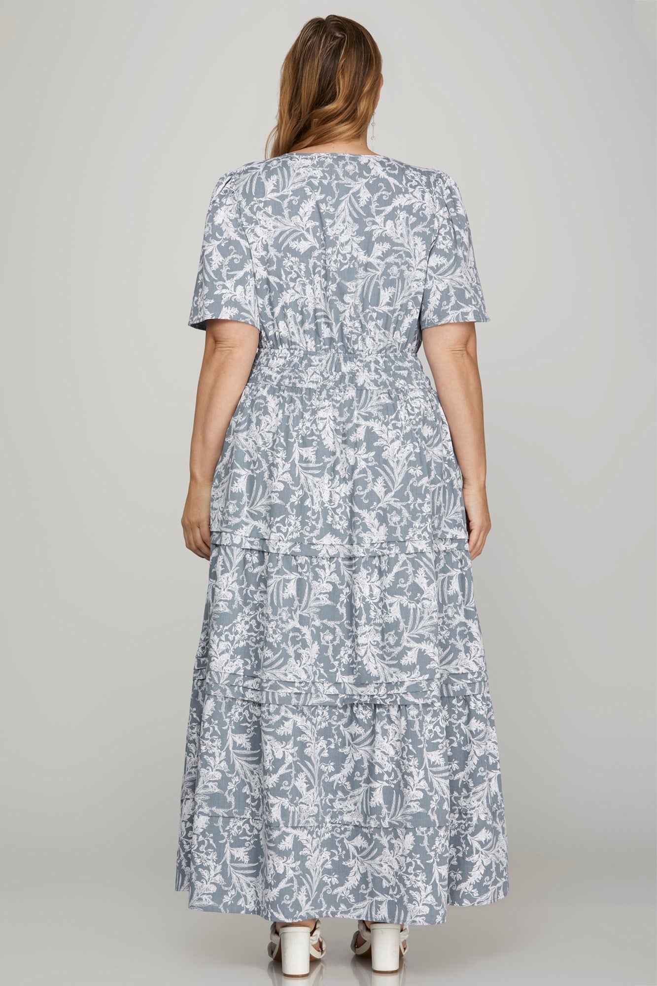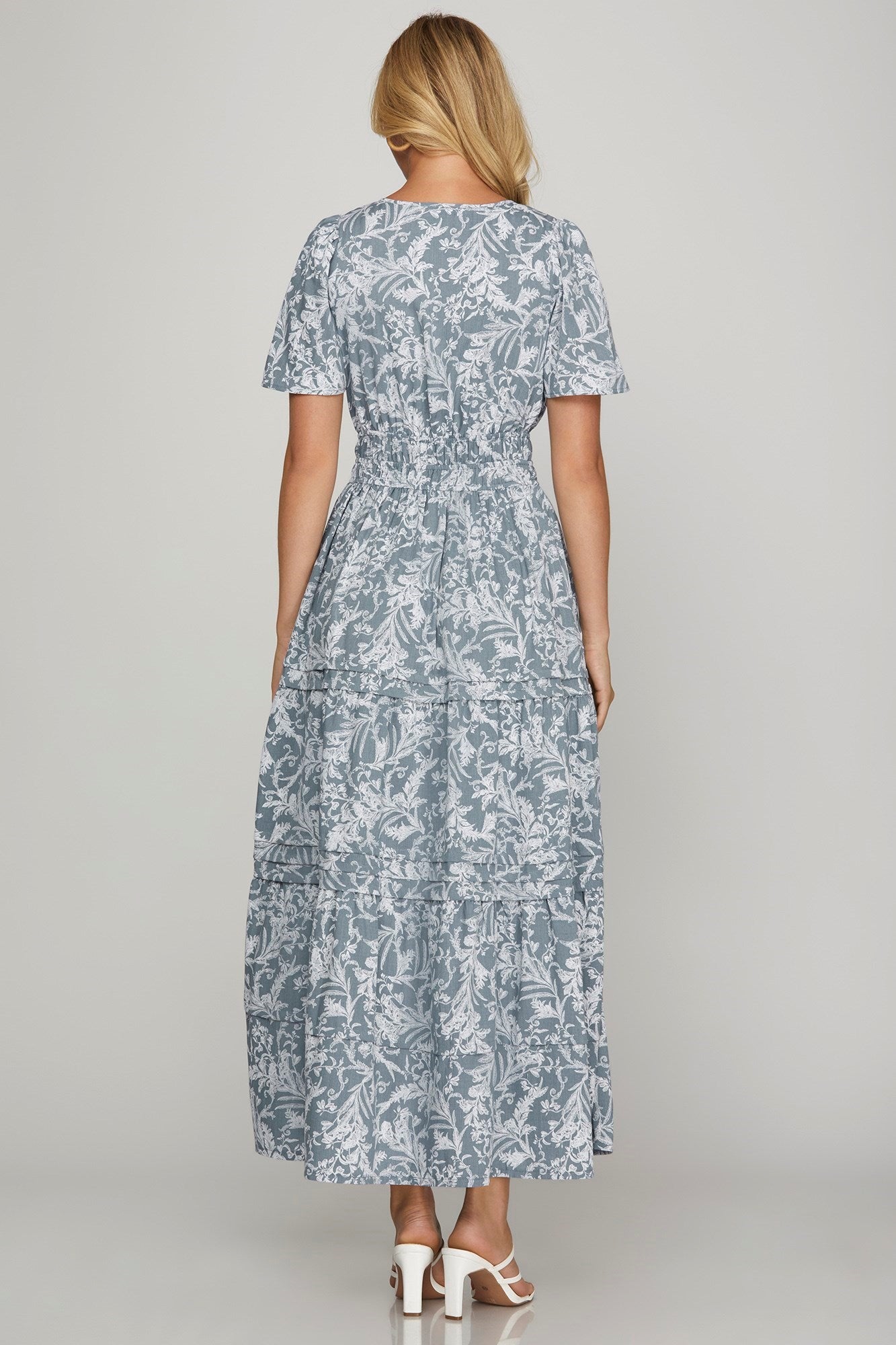 She + Sky Printed Notched Woven Tiered Pintuck Maxi Dress with Side Pockets