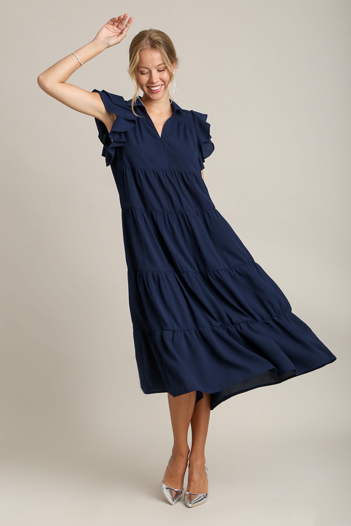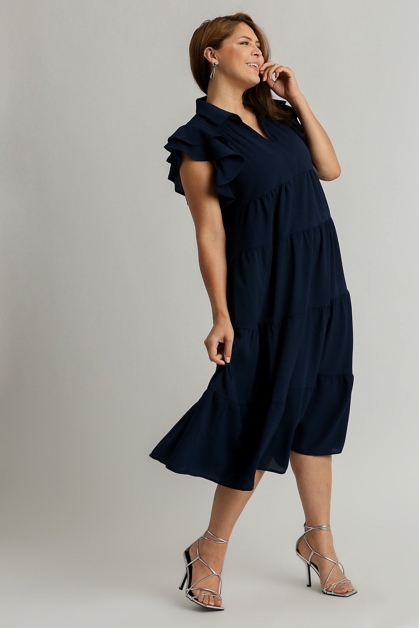 Umgee Full Size Johnny Collar Ruffle Cap Sleeve Tiered Dress Plus Size