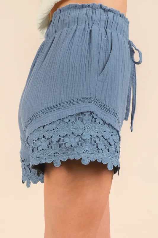 Lace contrast detail woven shorts are chic and stylish bottoms that feature delicate lace accents. These shorts combine a woven fabric with lace detailing for a feminine and elegant look. The lace adds a touch of sophistication and texture to the shorts, making them perfect for both casual and dressed-up occasions. Pair these shorts with a tucked-in blouse or a simple top for a fashionable and trendy ensemble.
