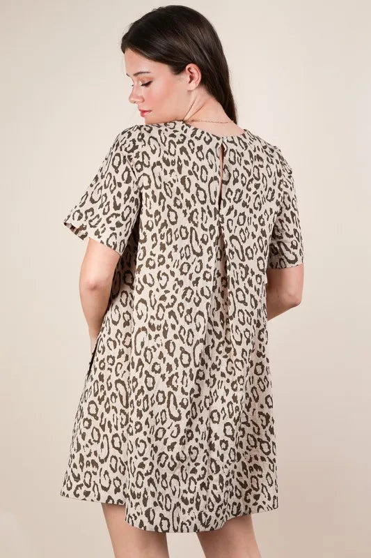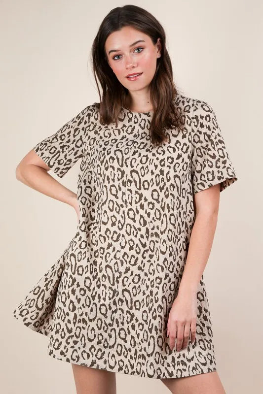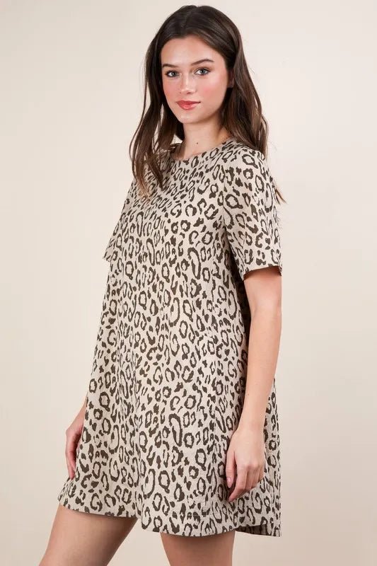 A leopard-printed comfy mini dress is a trendy and comfortable piece with a stylish animal print pattern. This dress combines a fashionable leopard print with a relaxed and easy-to-wear mini-length silhouette. Perfect for both casual outings and adding a touch of flair to your wardrobe, this dress is a versatile and on-trend choice for any fashionista.
