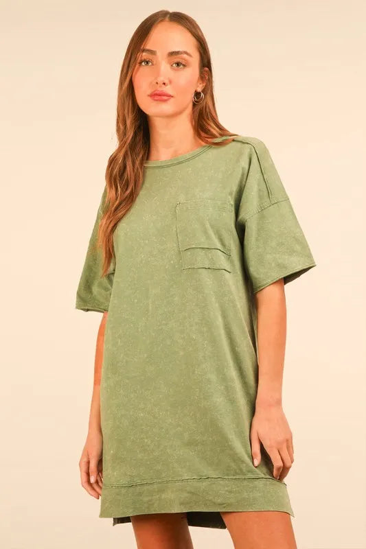 A mineral washed knit shift mini dress is a casual and versatile garment with a relaxed, flowy silhouette. The mineral wash technique gives the dress a soft, muted color and a subtle vintage appearance. The knit fabric offers comfort and ease of movement, making this mini dress a practical and stylish choice for everyday wear.