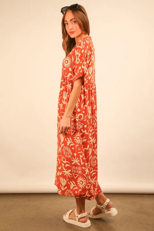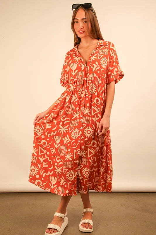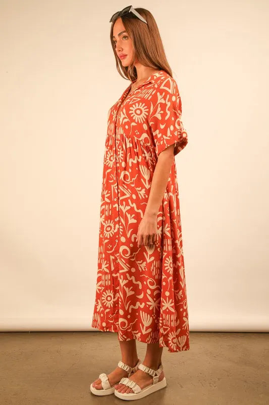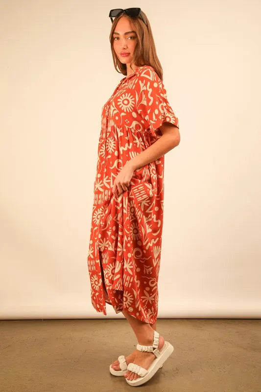 An oversized printed shirt midi dress combines style and comfort effortlessly. The loose fit offers a relaxed and chic look. The printed design adds a pop of personality to the outfit. Perfect for a versatile and trendy ensemble.