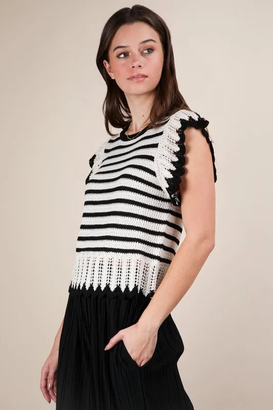 A ruffled detail striped knit sweater top combines texture and style effortlessly. The stripes add a classic touch, while the ruffles bring a feminine flair. This versatile top can be dressed up or down for any occasion.
