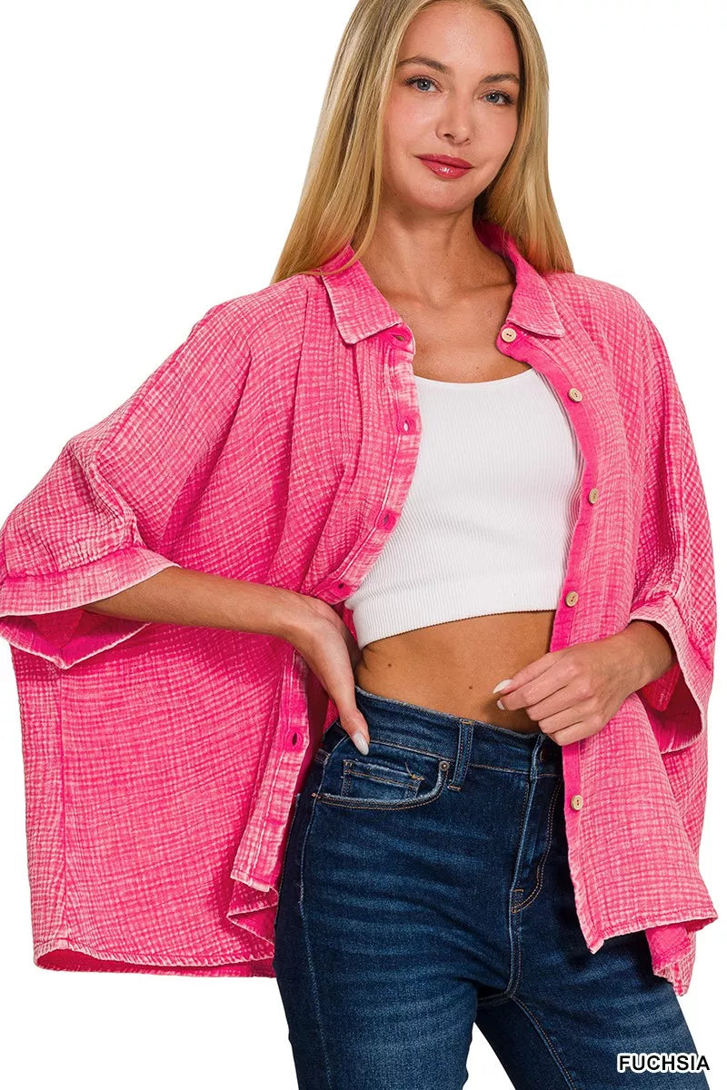 This washed double gauze button-down shirt features half sleeves for a relaxed and stylish look. The double gauze fabric offers a soft and breathable feel, perfect for warm weather. With its button-down design, this shirt provides a versatile and classic aesthetic. Elevate your casual wardrobe with this laid-back yet chic piece that can be dressed up or down. Embrace comfort and style with this washed double gauze shirt, ideal for effortless and cool outfits.