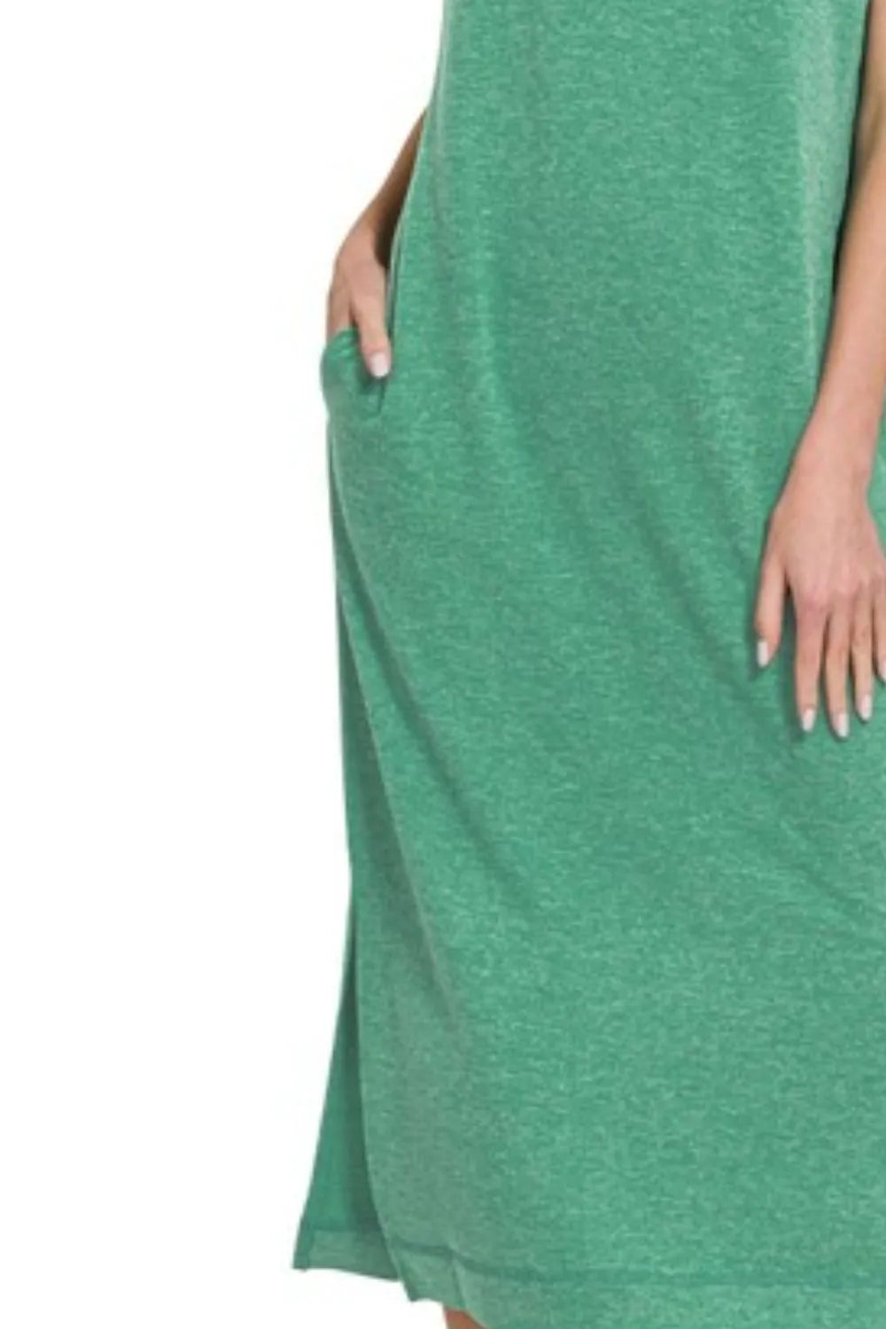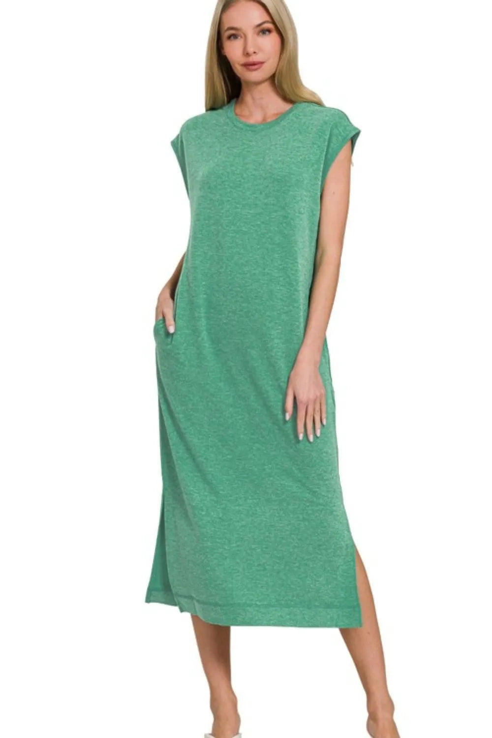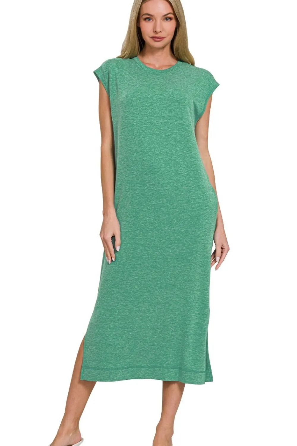 This casual midi dress features a comfortable heathered jersey construction in a beautiful sage green shade. The relaxed fit silhouette includes practical side slits and cap sleeves for ease of movement. Made from a soft, breathable knit fabric that's perfect for all-day wear. The versatile design can be dressed up or down, making it ideal for various occasions from casual outings to weekend brunches. The midi length and round neckline create a balanced, flattering look suitable for many body types.