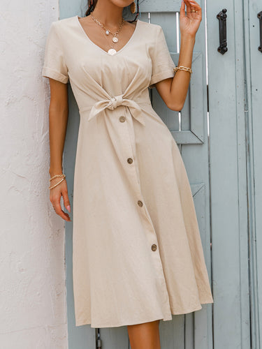 Half Button Tie Waist Flutter Sleeve Midi Dress