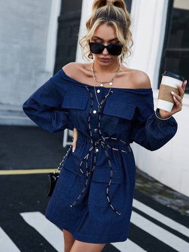 Off-Shoulder Drawstring Denim Dress with Pockets