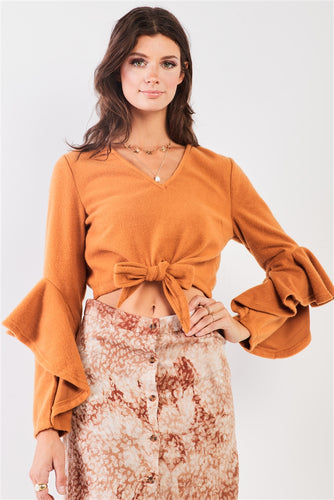 Camel Fuzzy Long Ruffle Sleeve V-Neck Self-Tie Front Detail Cropped Top