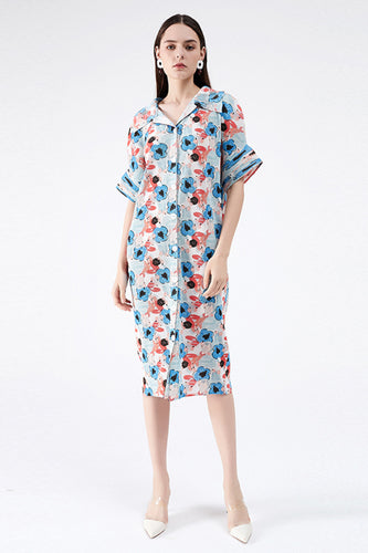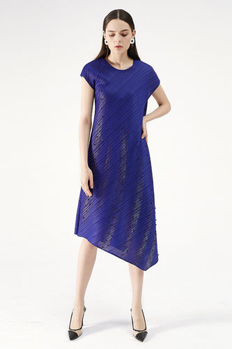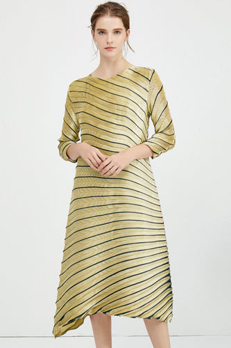 Striped Asymmetrical Pleated Round Neck Midi Dress