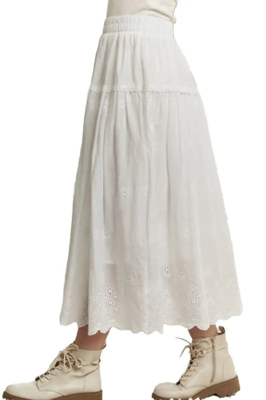 The elastic waistband midi length tiered skirt is a versatile and comfortable bottom that can elevate your outfit with ease. The elastic waistband provides a flexible and comfortable fit, while the tiered design adds volume and texture to the skirt. The midi length offers a stylish and modest silhouette that is perfect for various occasions. This skirt can be dressed up with a blouse and heels for a chic look or dressed down with a t-shirt and sneakers for a more casual vibe. The elastic waistband ensures a flattering and comfortable fit for all-day wear.