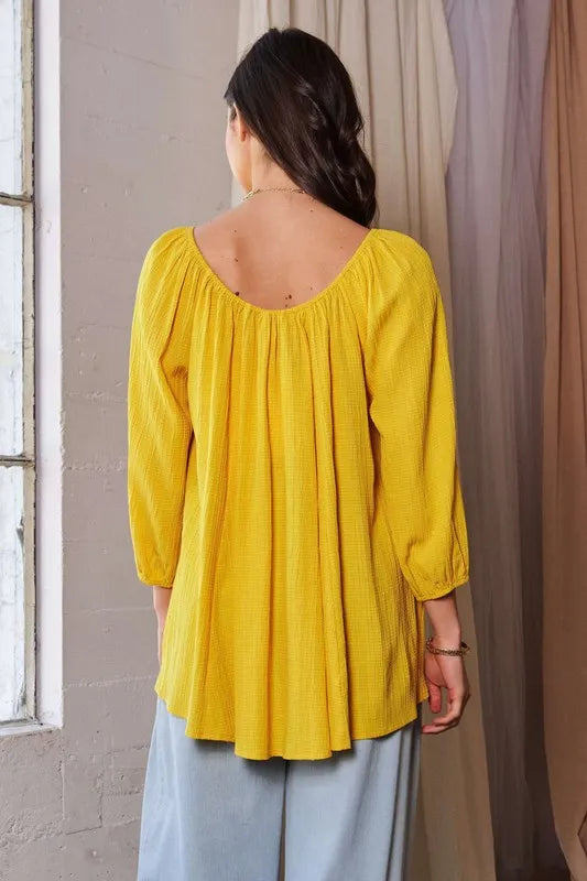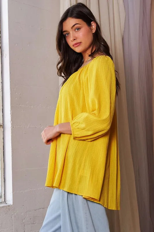 A crinkled texture fabric round neck swing top is a versatile and stylish piece that features a unique, textured fabric with a relaxed and swingy silhouette. The crinkled texture adds depth and interest to the fabric, while the round neck design provides a classic and flattering neckline. This top is perfect for a casual yet chic look and can be paired with jeans or leggings for a comfortable and fashionable outfit.