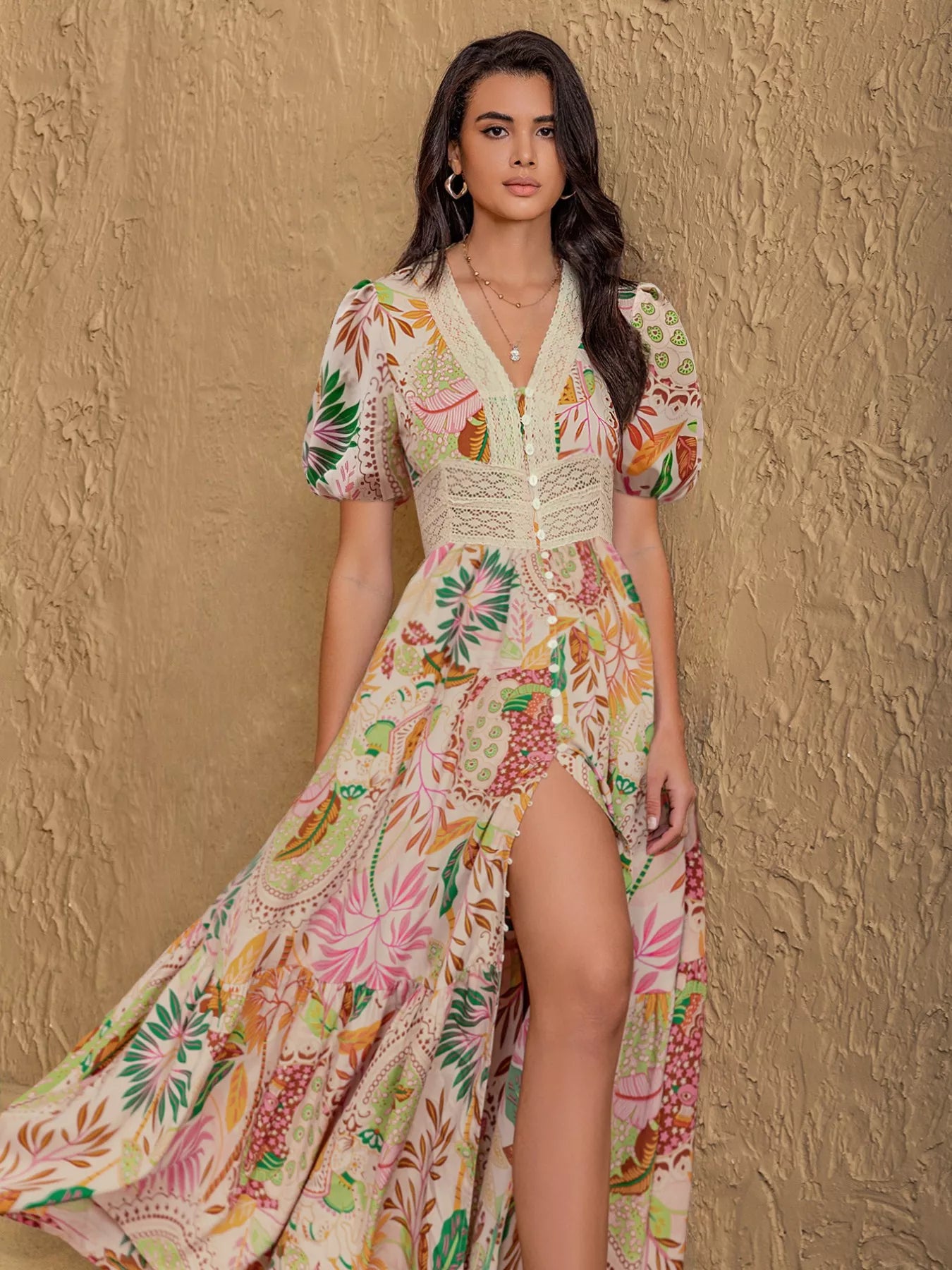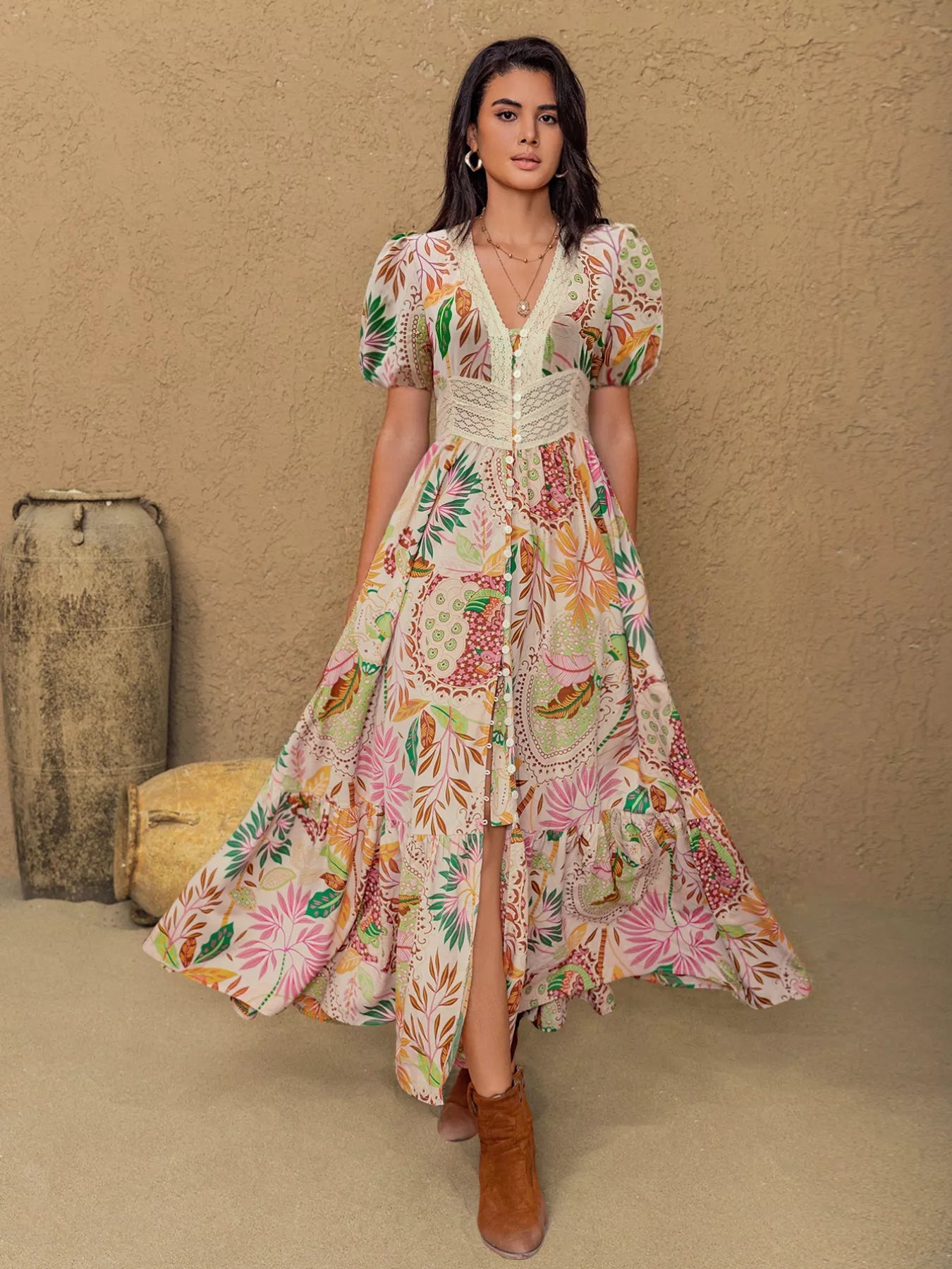 Lace Trim Floral Print Puff Sleeve Dress