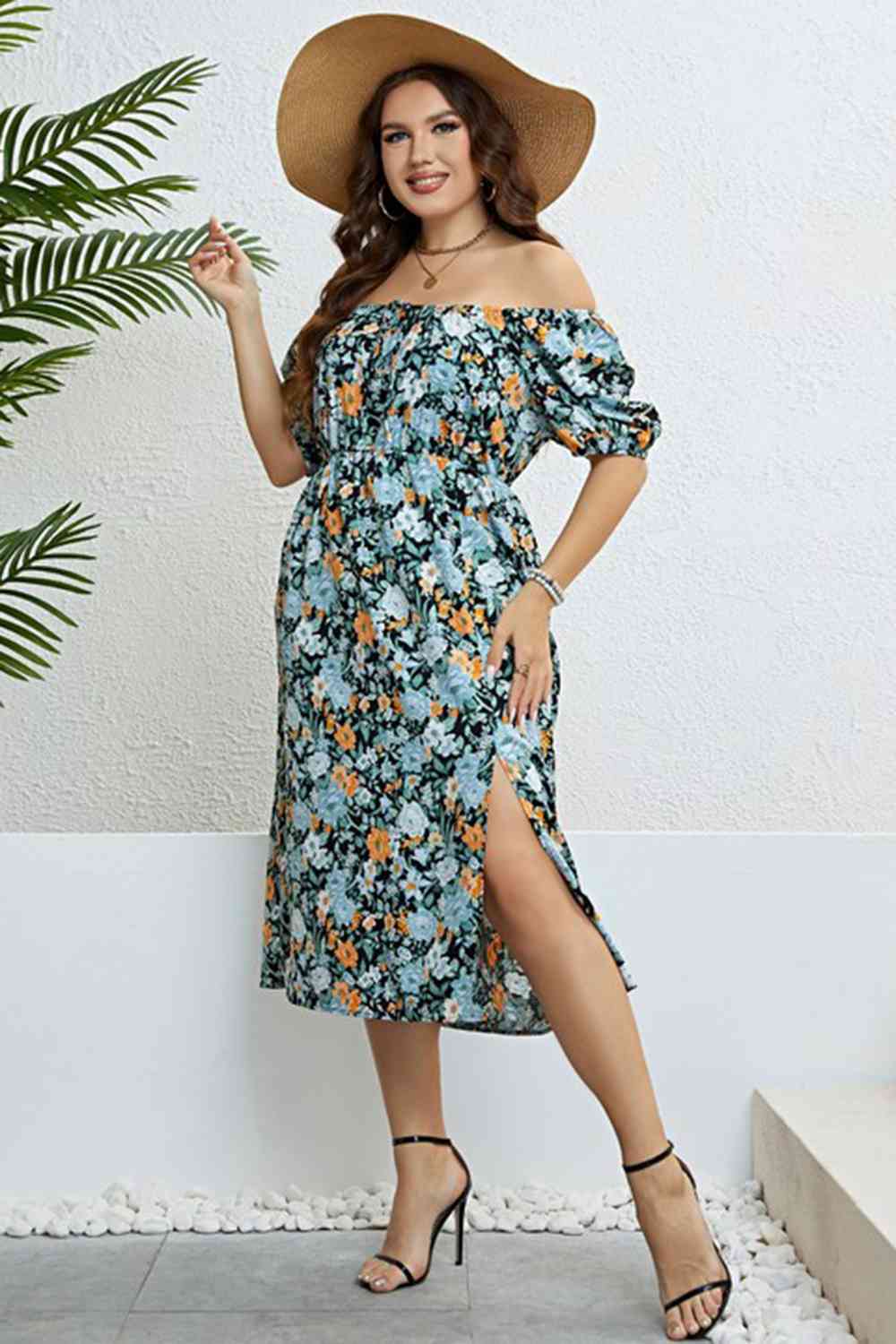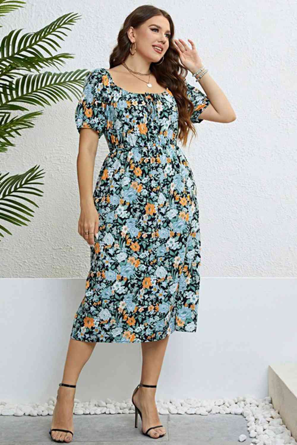 Plus Size Floral Short Sleeve Slit Dress