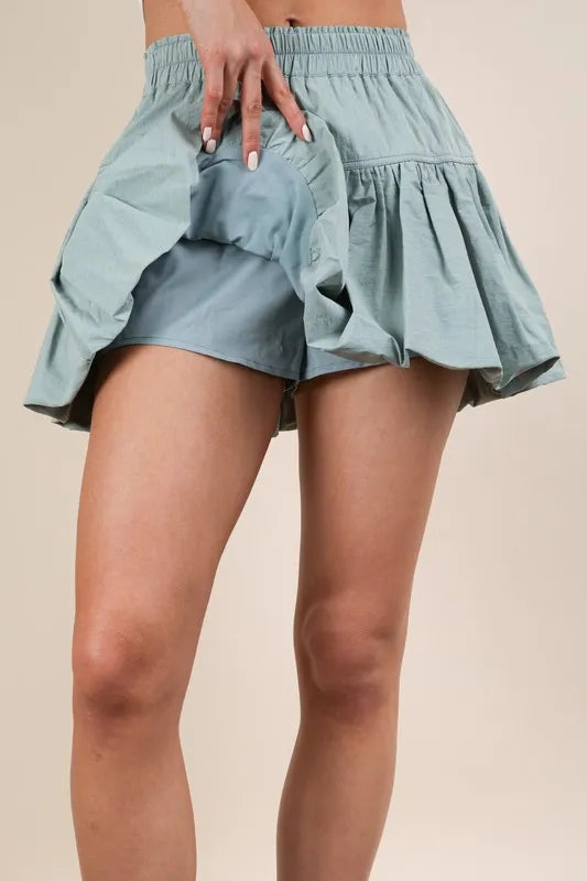 A bubble mini skirt with inner shorts is a cute and practical piece for an active lifestyle. The bubble hem adds a fun and playful element to the skirt, while the inner shorts provide comfort and coverage. This versatile piece can be styled with a tucked-in blouse or a graphic tee for a casual and trendy look. Perfect for a day out or a fun weekend adventure!