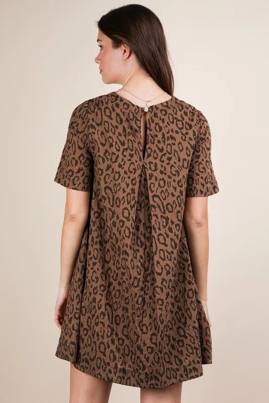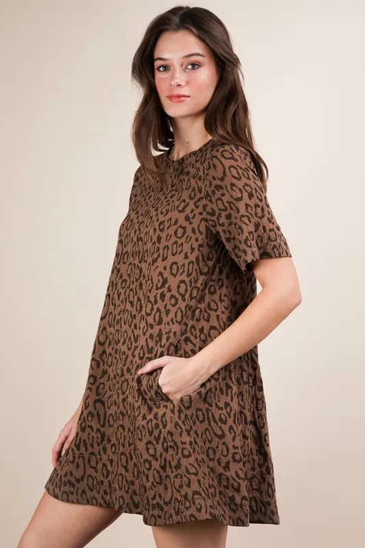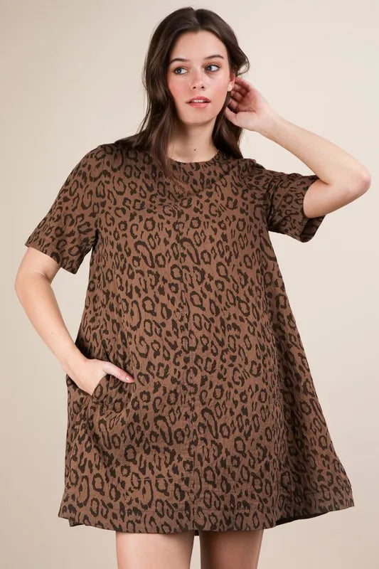 A leopard-printed comfy mini dress is a trendy and comfortable piece with a stylish animal print pattern. This dress combines a fashionable leopard print with a relaxed and easy-to-wear mini-length silhouette. Perfect for both casual outings and adding a touch of flair to your wardrobe, this dress is a versatile and on-trend choice for any fashionista.