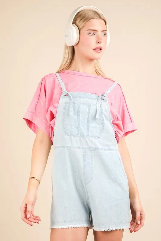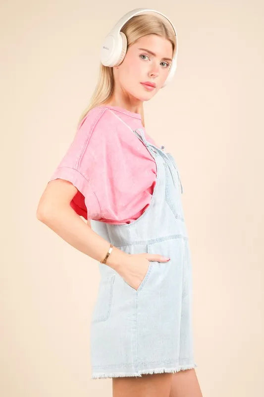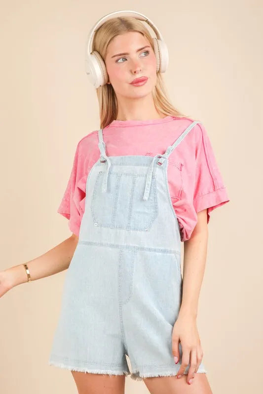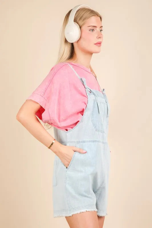 A mineral-washed denim casual romper is a trendy and versatile one-piece outfit featuring a soft, worn-in look created through the mineral washing process. This romper combines the comfort of denim with a relaxed and casual style, making it perfect for everyday wear. The mineral wash adds a unique texture and vintage vibe to the romper, offering a fashionable and effortless option for a variety of occasions.