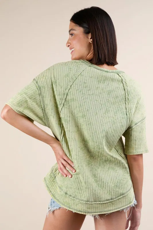 The mineral washed ribbed knit casual top combines a trendy style with comfort. The ribbed knit texture adds a unique touch to the design. Perfect for a laid-back and chic look for various occasions.
