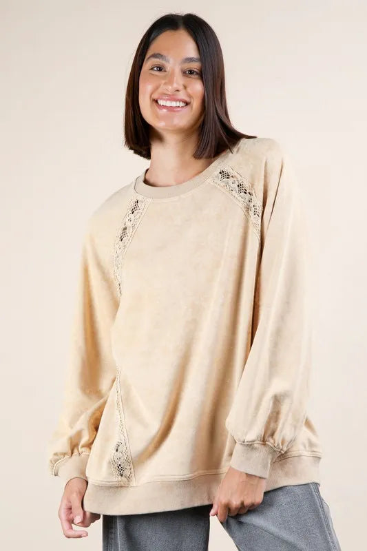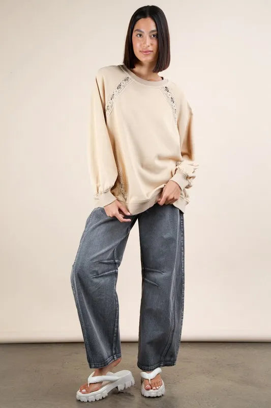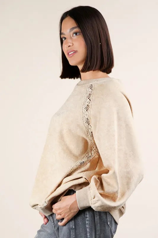 VERY J Plus Size Lace Trim Detail Mineral Washed Knit Top