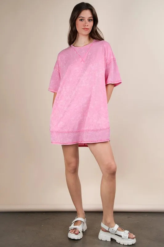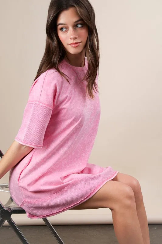 The mineral washed comfy casual knit mini dress combines comfort with style. Its mineral wash gives it a unique and trendy appearance. Perfect for a laid-back and effortlessly chic outfit.