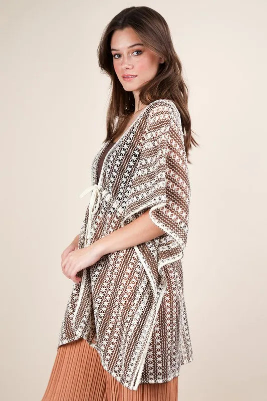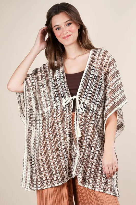 The striped poncho boho cardigan is a versatile and stylish layering piece. Its bohemian-inspired design adds a touch of flair to any outfit. Perfect for creating a relaxed and chic look with a cozy feel.